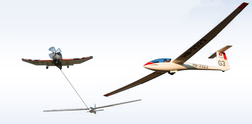 Les planeurs d’une envergure de 4 m sont mis en altitude jusqu’à 200 m à l’aide d’un avion remorqueur muni d’un câble de 25 m.